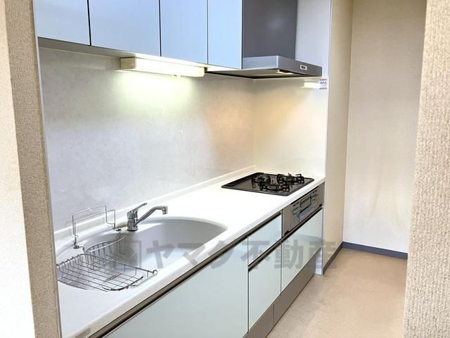 お料理の効率がアップする三口コンロを備えた、機能的なシステムキッチンです。上下に豊富な収納スペースがあり、調理器具や食器もスッキリ片付きます。広めのシンクは、大きなお鍋の洗い物も快適です。