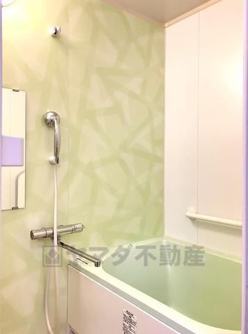 柔らかなグリーンのパネルがアクセントになった、清潔感あふれるバスルームです。ゆったりとした浴槽で、一日の疲れを癒すリラックスタイムを過ごせます。水はけの良い床材で、日々のお掃除も楽々です。
