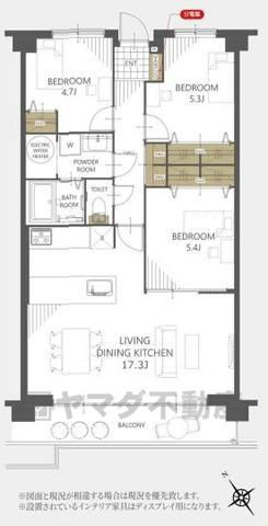 | 間取り詳細 | LDK17.3畳、洋5.4畳、洋5.3畳、洋4.7畳 | 土地権利 | 所有権 |